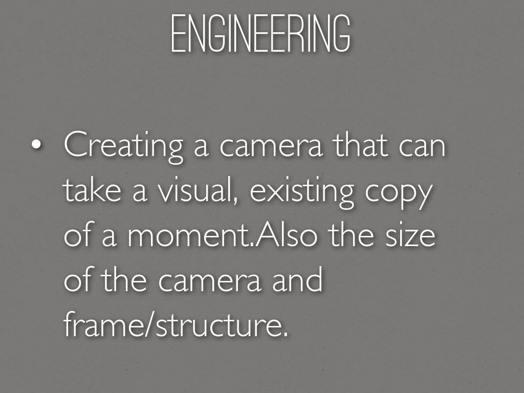 Creating a camera that can take a visual, existing copy of a moment.Also the size of the camera and frame/structure.