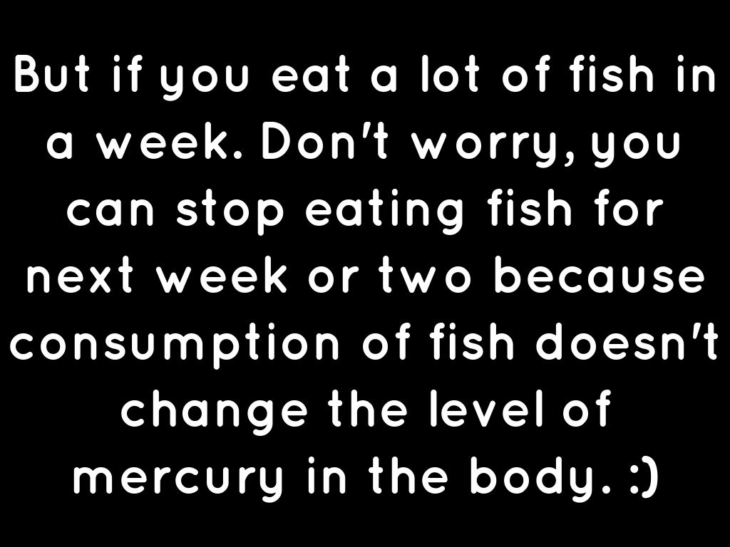 But if you eat a lot of fish in a week. Don't worry, you can stop eating fish for next week or two because consumption of fish doesn't change the level of mercury in the body. :)