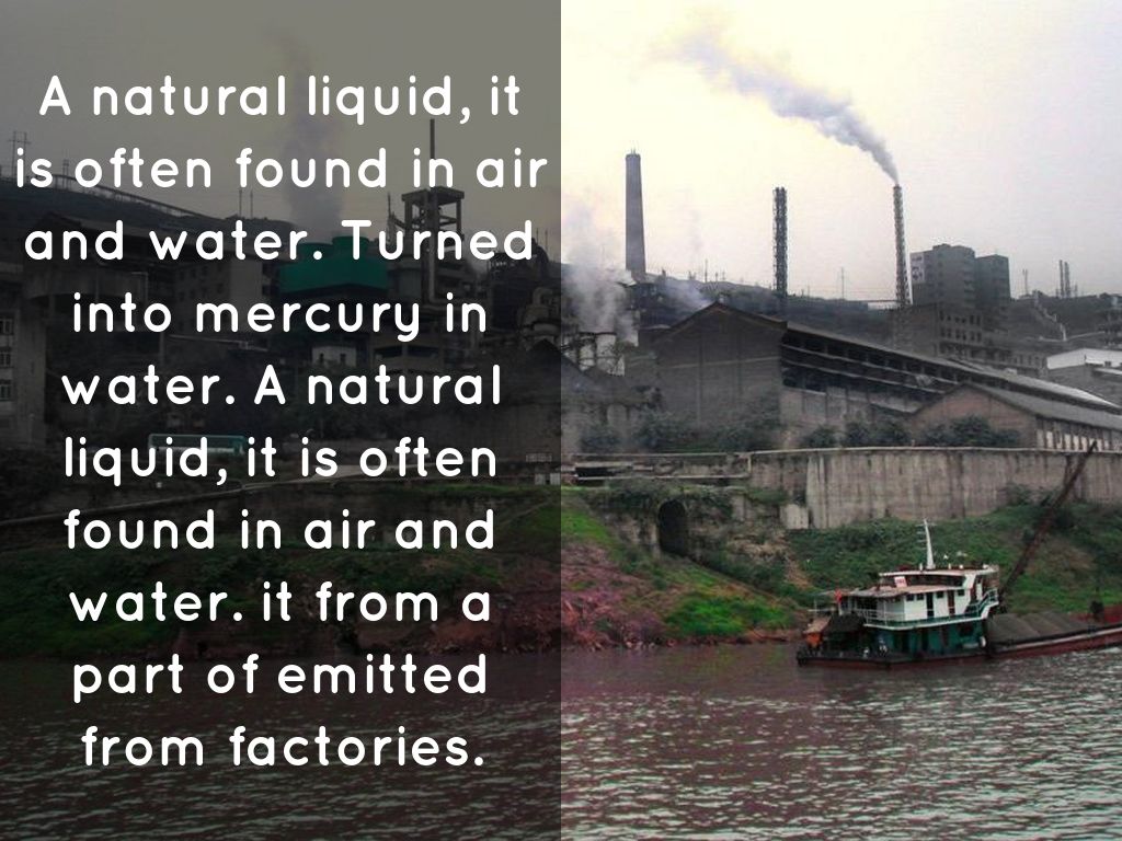 A natural liquid, it is often found in the air and water. Turned into mercury in water. It from a part of emitted from factories.