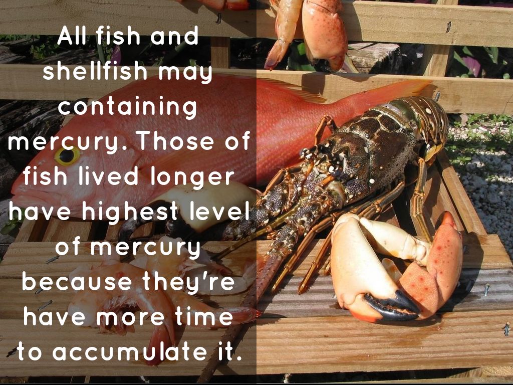 All fish and shellfish may containing mercury. Those of fish lived longer have highest level of mercury because they're have more time to accumulate it.
