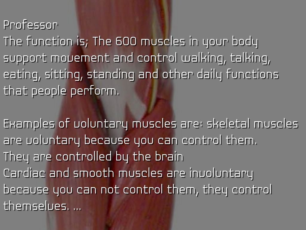 Examples of voluntary muscles are: skeletal muscles are voluntary because you can control them.