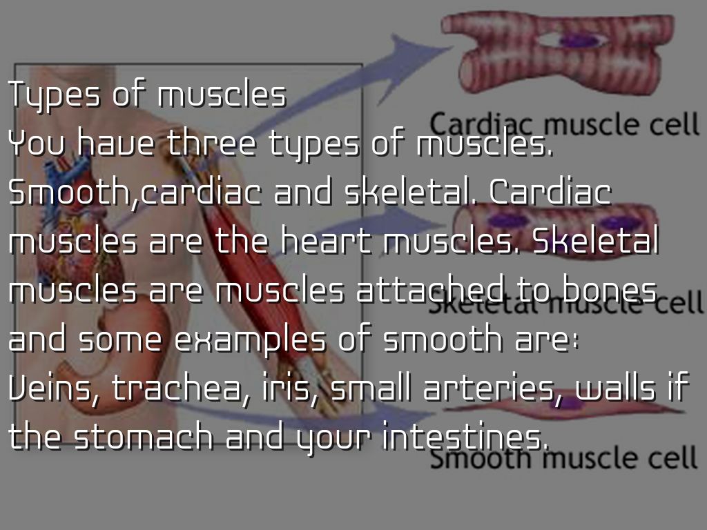 You have three types of muscles. Smooth,cardiac and skeletal. Cardiac muscles are the heart muscles. Skeletal muscles are muscles attached to bones and some examples of smooth are:
