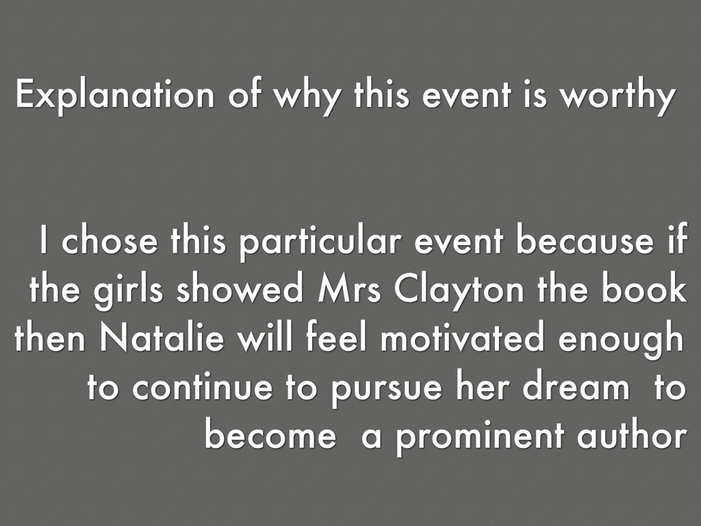 I chose this particular event because if the girls showed Mrs Clayton the book then Natalie will feel motivated enough to continue to pursue her dream to become a prominent author