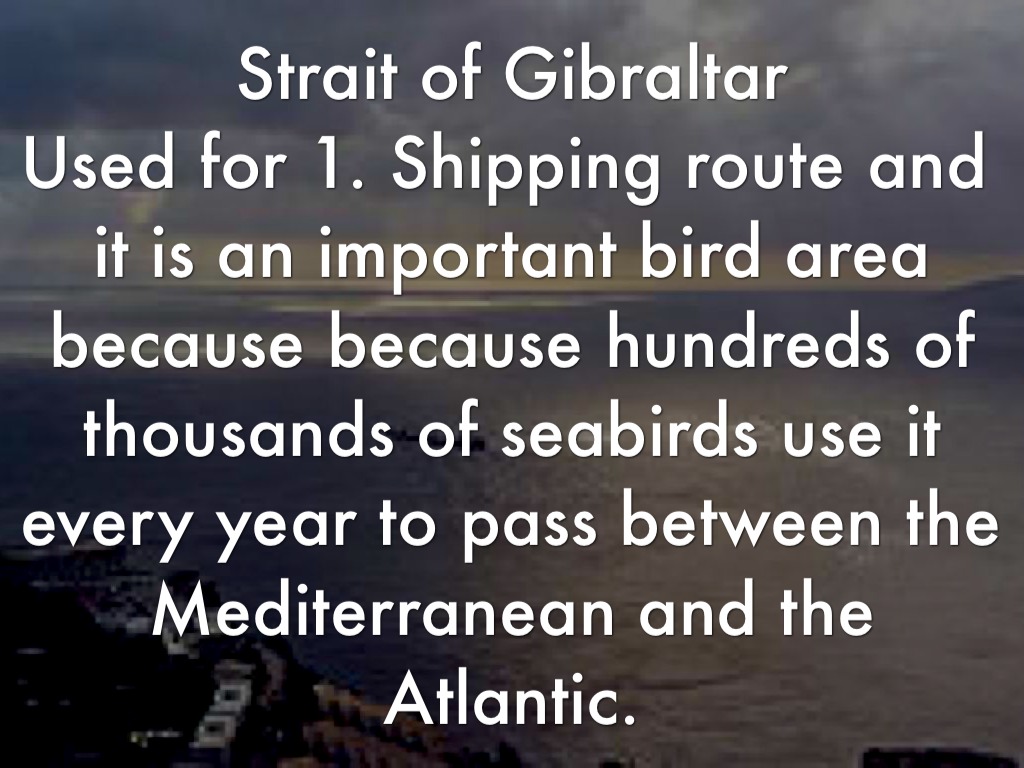 Used for 1. Shipping route and it is an important bird area because because hundreds of thousands of seabirds use it every year to pass between the Mediterranean and the Atlantic.
