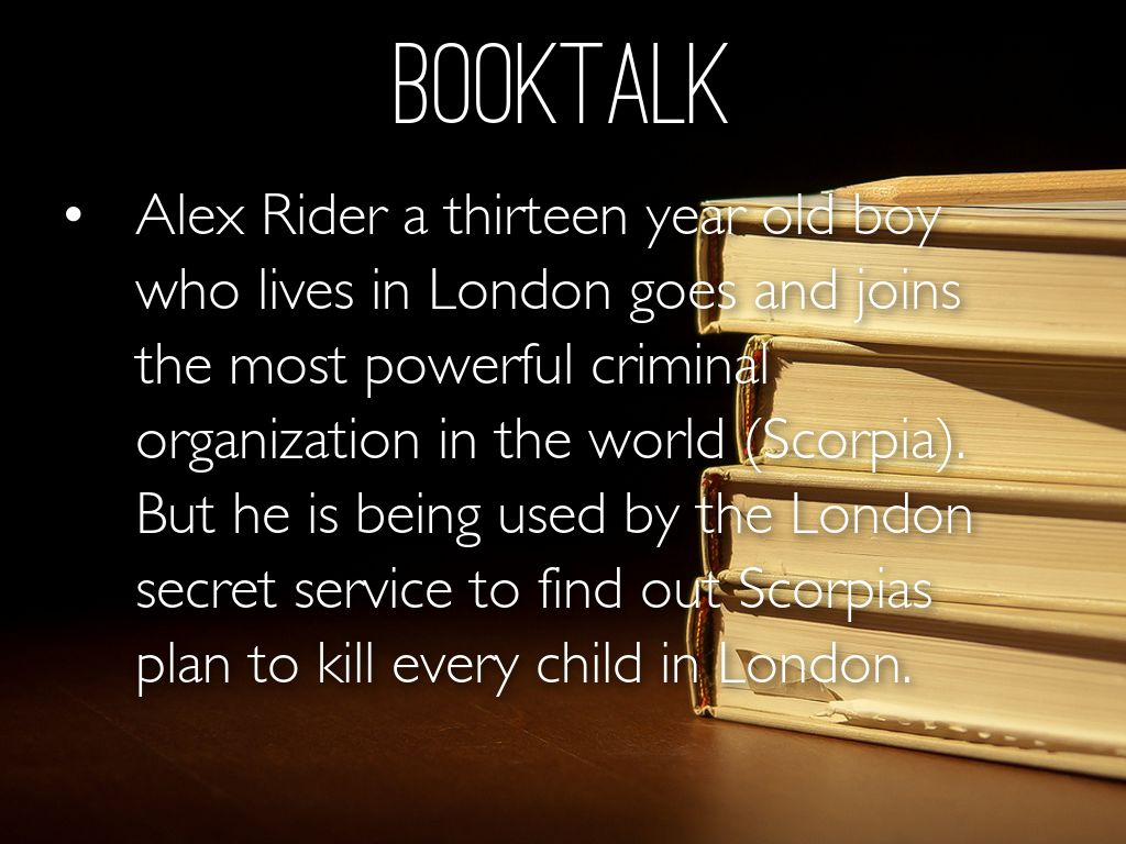Alex Rider a thirteen year old boy who lives in London goes and joins the most powerful criminal organization in the world (Scorpia). But he is being used by the London secret service to find out Scorpias plan to kill every child in London.