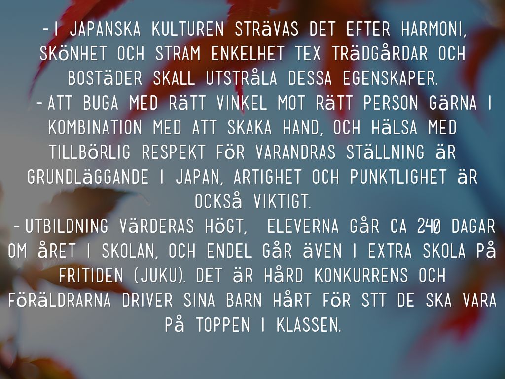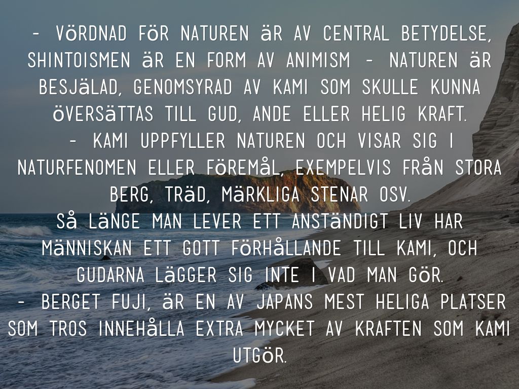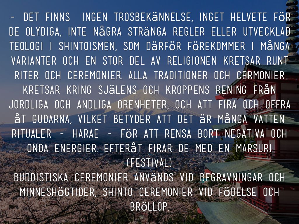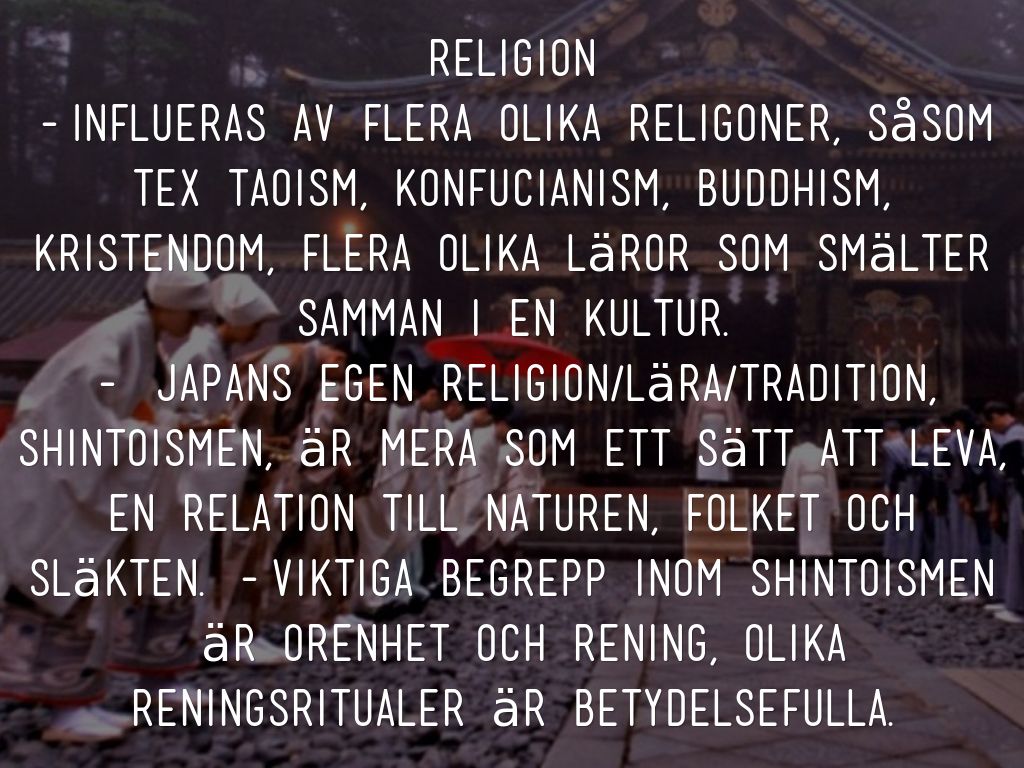 - Japans egen religion/lära/tradition, Shintoismen, är mera som ett sätt att leva, en relation till naturen, folket och släkten. -viktiga begrepp inom shintoismen är orenhet och rening, olika reningsritualer är betydelsefulla.