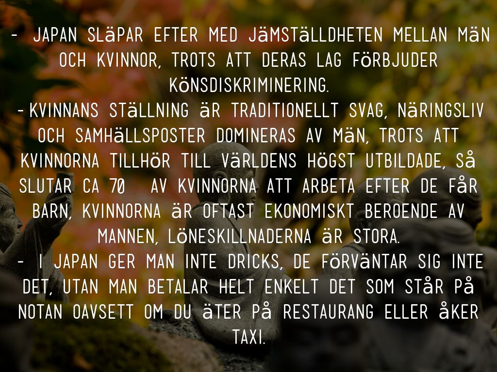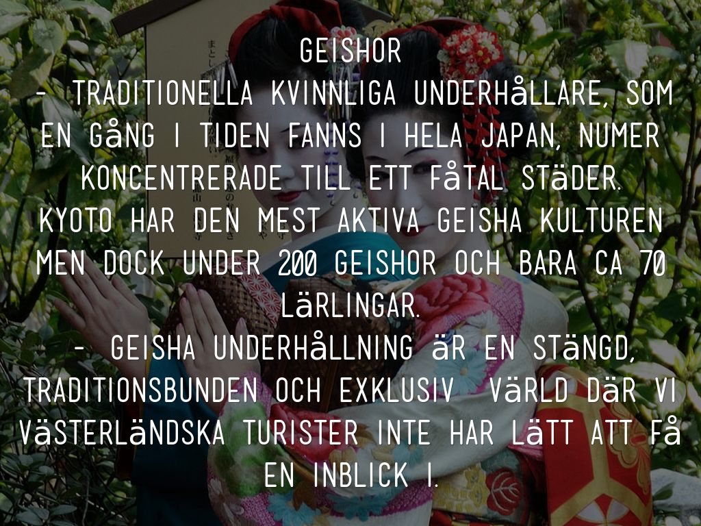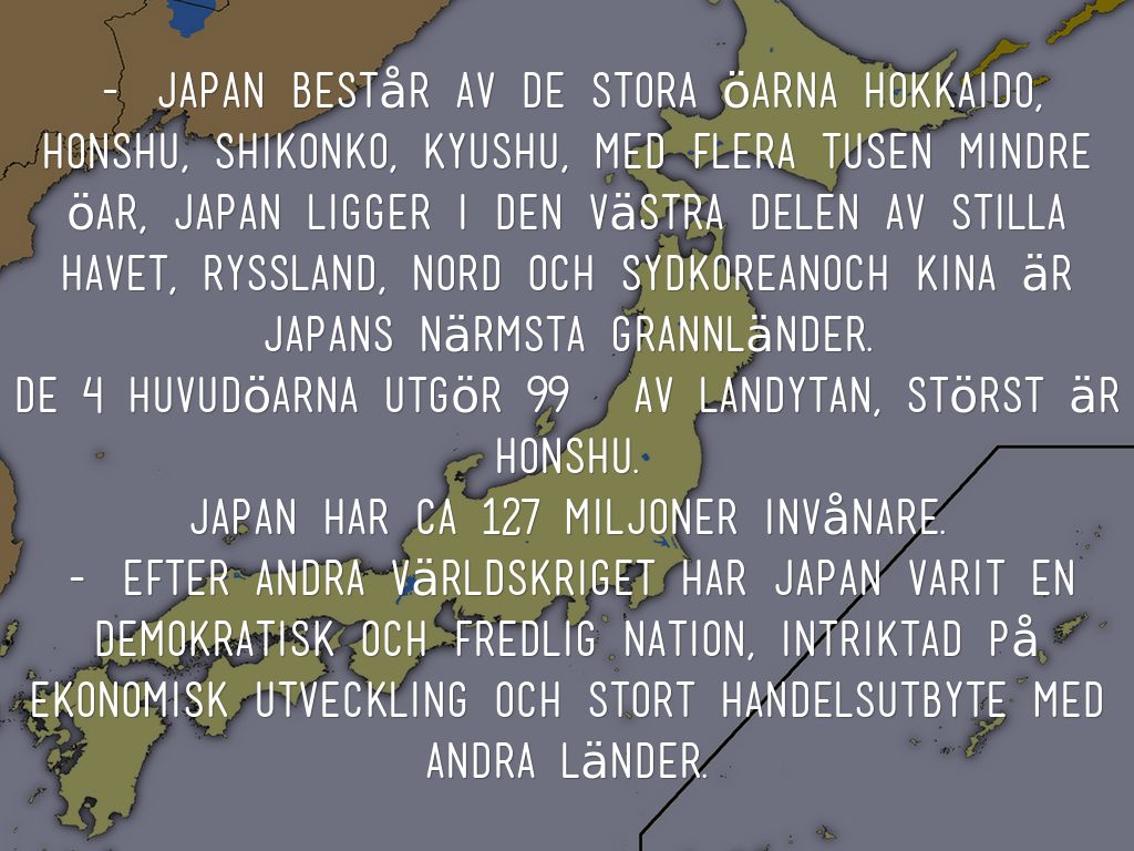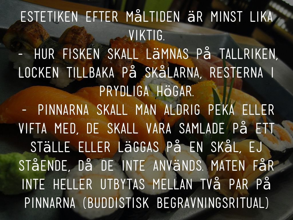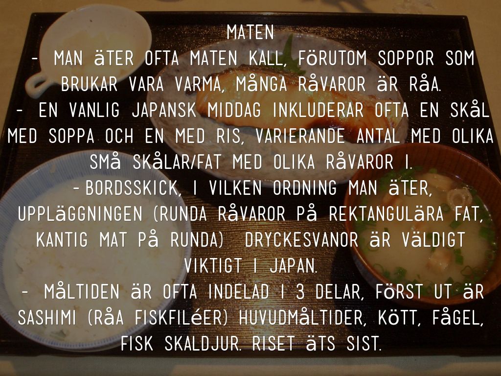 - Japans egen religion/lära/tradition, Shintoismen, är mera som ett sätt att leva, en relation till naturen, folket och släkten. -viktiga begrepp inom shintoismen är orenhet och rening, olika reningsritualer är betydelsefulla.