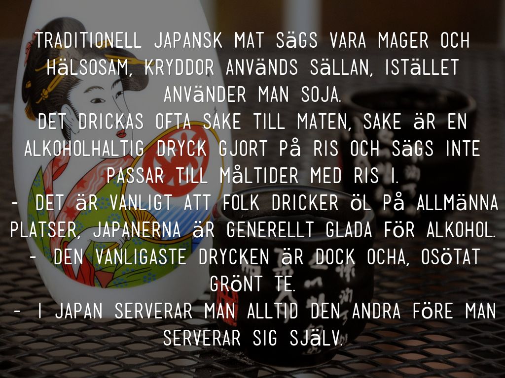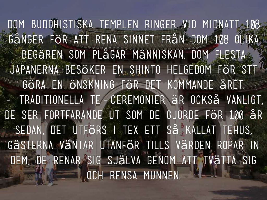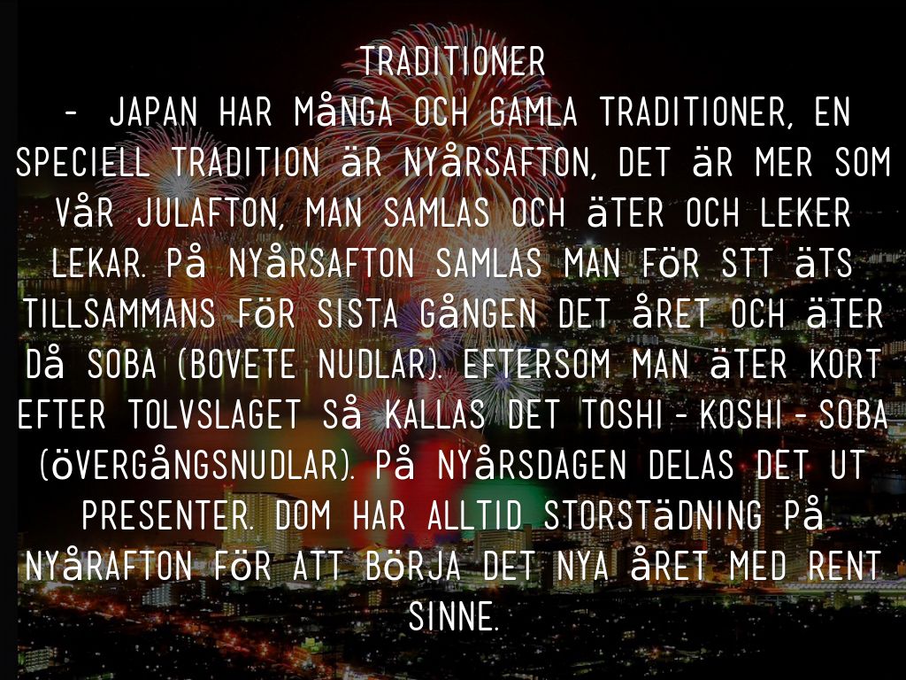 - Japan har många och gamla traditioner, en speciell tradition är nyårsafton, det är mer som vår julafton, man samlas och äter och leker lekar. På nyårsafton samlas man för stt äts tillsammans för sista gången det året och äter då soba (bovete nudlar). Eftersom man äter kort efter tolvslaget så kallas det toshi-koshi-soba (övergångsnudlar). På nyårsdagen delas det ut presenter. Dom har alltid storstädning på nyårafton för att börja det nya året med rent sinne.