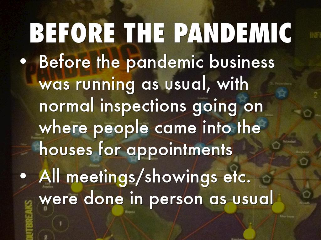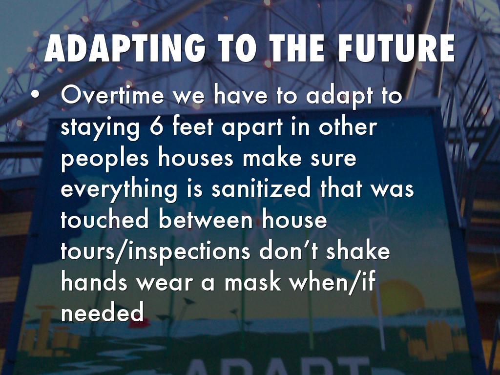 Overtime we have to adapt to staying 6 feet apart in other peoples houses make sure everything is sanitized that was touched between house tours/inspections don’t shake hands wear a mask when/if needed