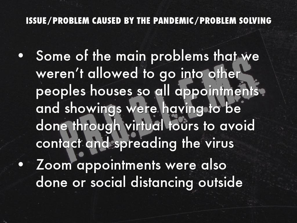 Some of the main problems that we weren’t allowed to go into other peoples houses so all appointments and showings were having to be done through virtual tours to avoid contact and spreading the virus