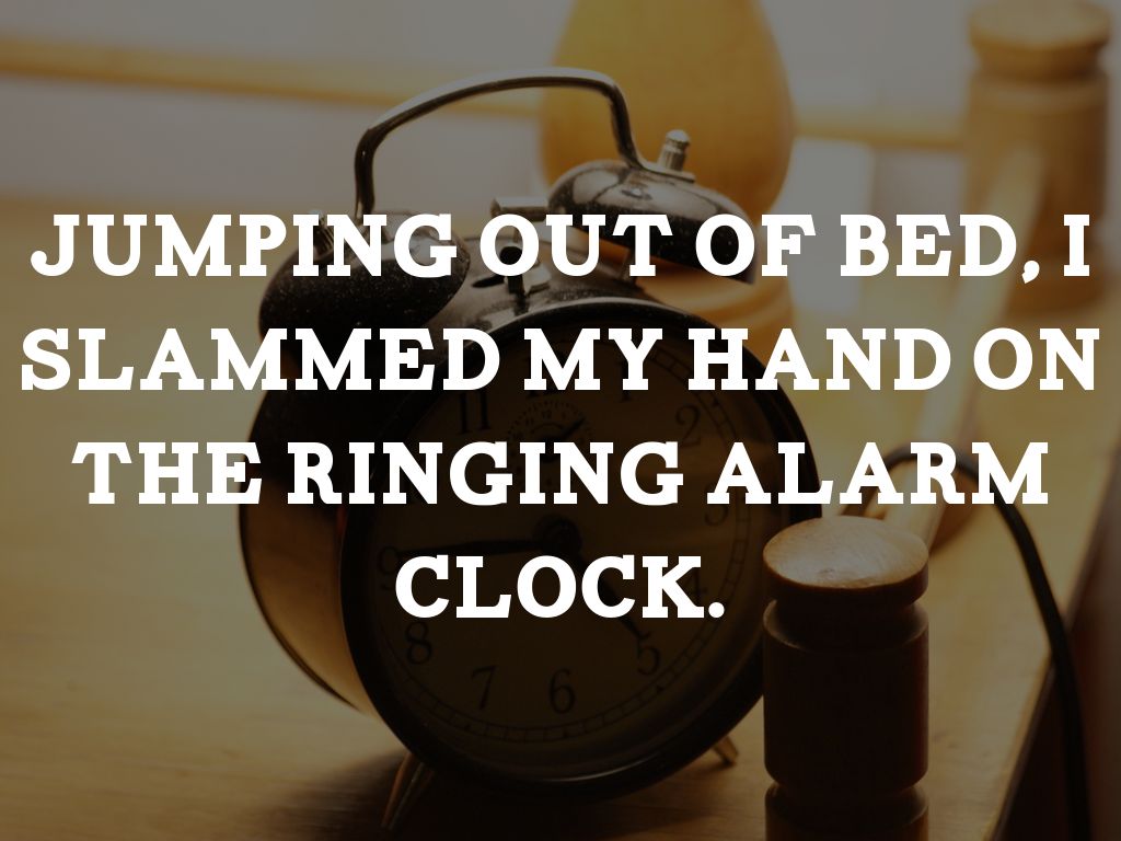 Jumping out of bed, i slammed my hand on the ringing alarm clock.