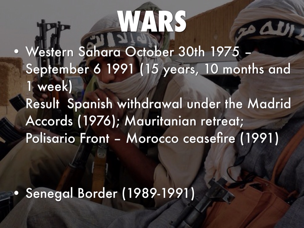 Western Sahara October 30th 1975 – September 6 1991 (15 years, 10 months and 1 week) Result Spanish withdrawal under the Madrid Accords (1976); Mauritanian retreat; Polisario Front – Morocco ceasefire (1991)