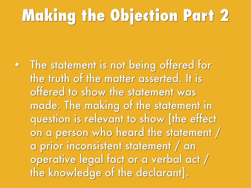 "The statement is not being offered for the truth of the matter asserted. Instead, it is offered to show the statement was made. The making of the statement in question is relevant to show [the effect on a person who heard the statement / a prior inconsistent statement]"