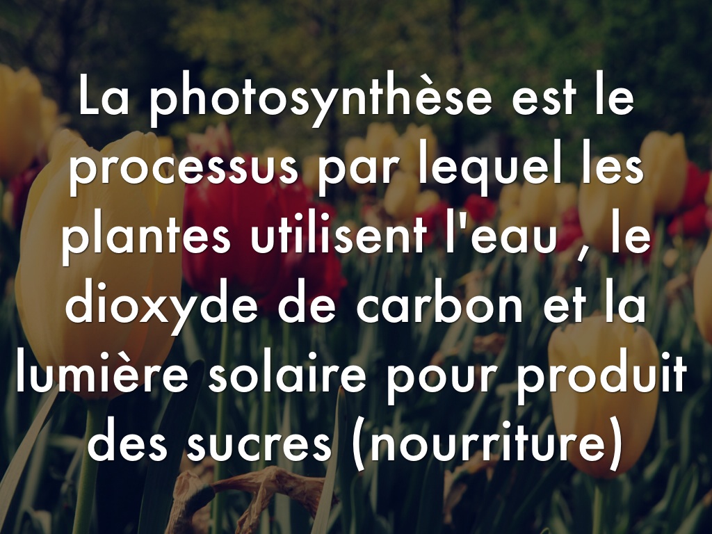 La photosynthèse est le processus par lequel les plantes utilisent l'eau , le dioxyde de carbon et la lumière solaire pour produit des sucres (nourriture)