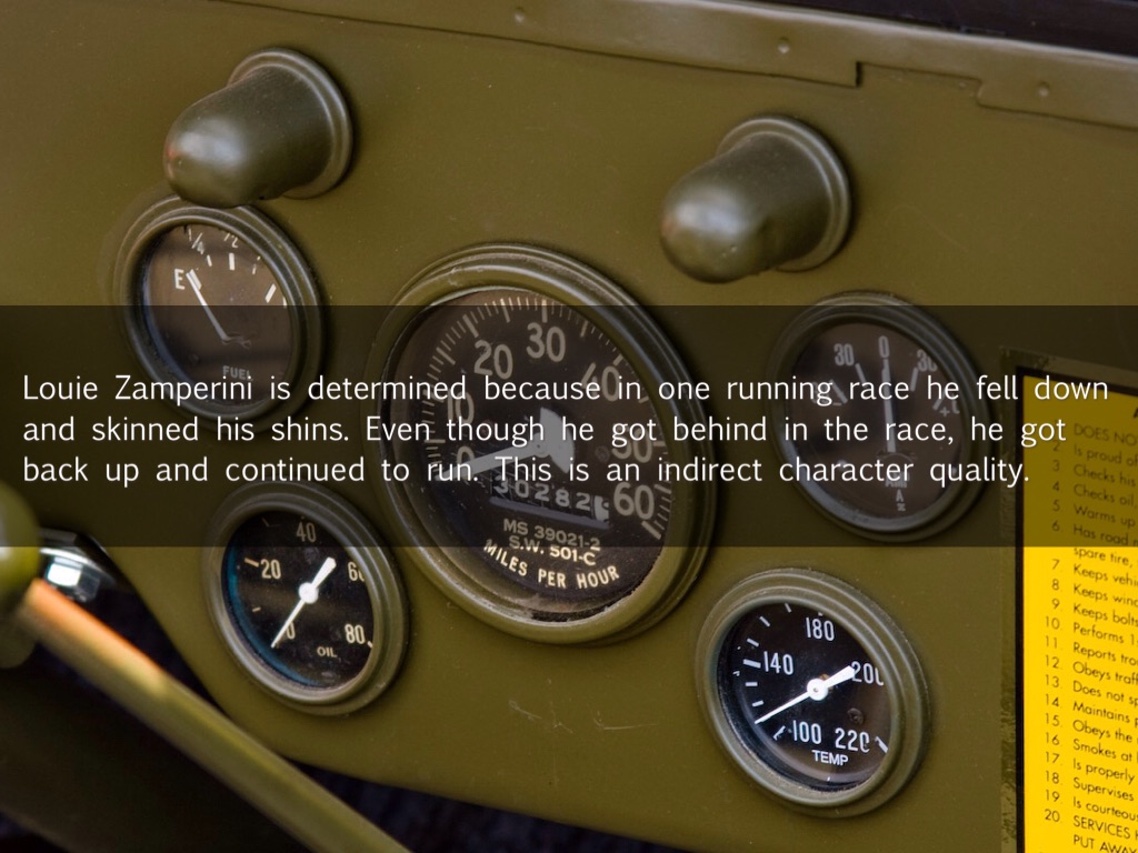 Louie Zamperini is determined because in one running race he fell down and skinned his shins. Even though he got behind in the race, he got back up and continued to run. This is an indirect character quality.