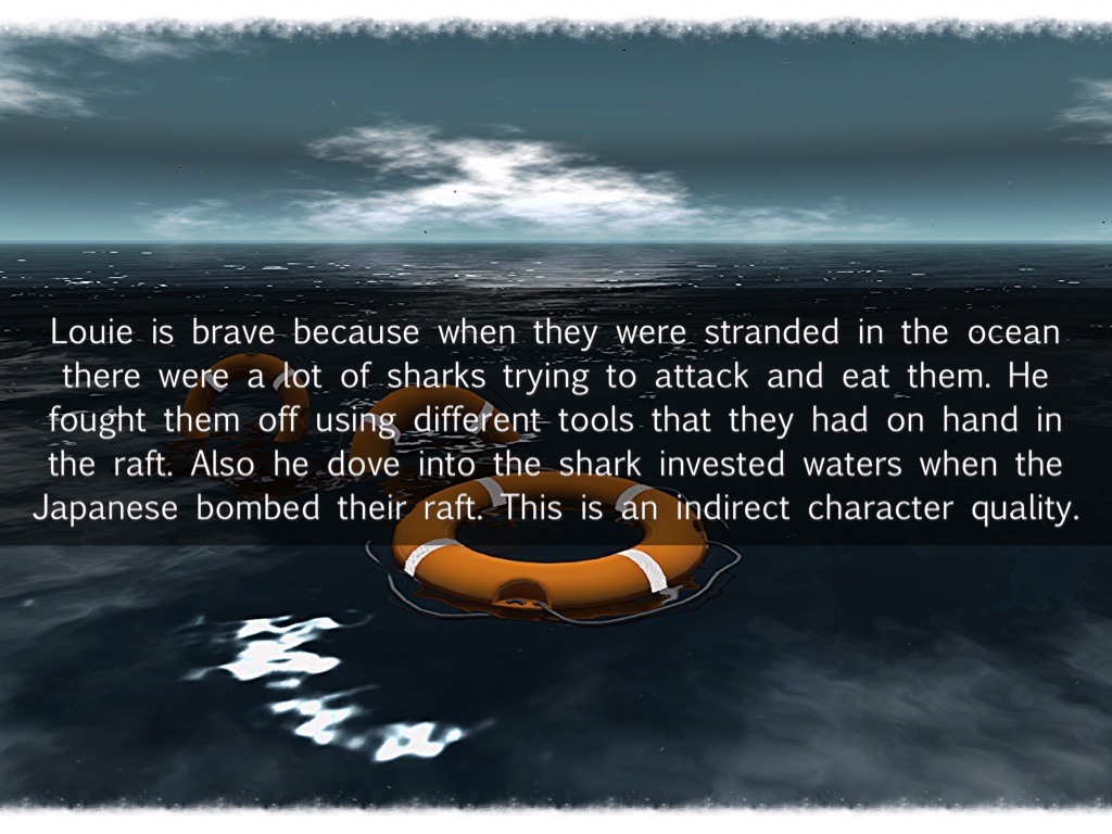Louie is brave because when they were stranded in the ocean there were a lot of sharks trying to attack and eat them. He fought them off using different tools that they had on hand in the raft. Also he dove into the shark invested waters when the Japanese bombed their raft. This is an indirect character quality.