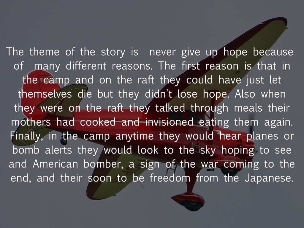 The theme of the story is never give up hope because of many different reasons. The first reason is that in the camp and on the raft they could have just let themselves die but they didn't lose hope. Also when they were on the raft they talked through meals their mothers had cooked and invisioned eating them again. Finally, in the camp anytime they would hear planes or bomb alerts they would look to the sky hoping to see and American bomber, a sign of the war coming to the end, and their soon to be freedom from the Japanese.