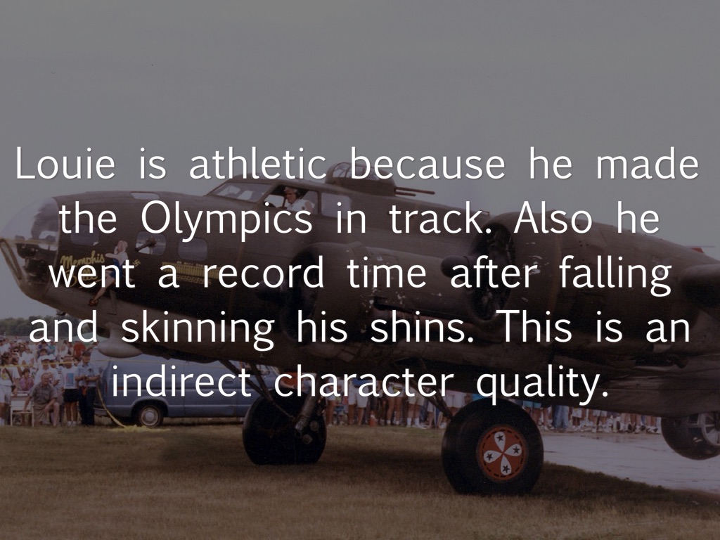 Louie is athletic because he made the Olympics in track. Also he went a record time after falling and skinning his shins. This is an indirect character quality.