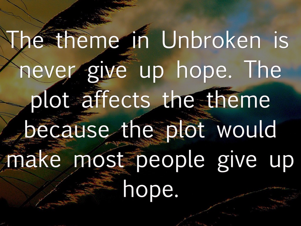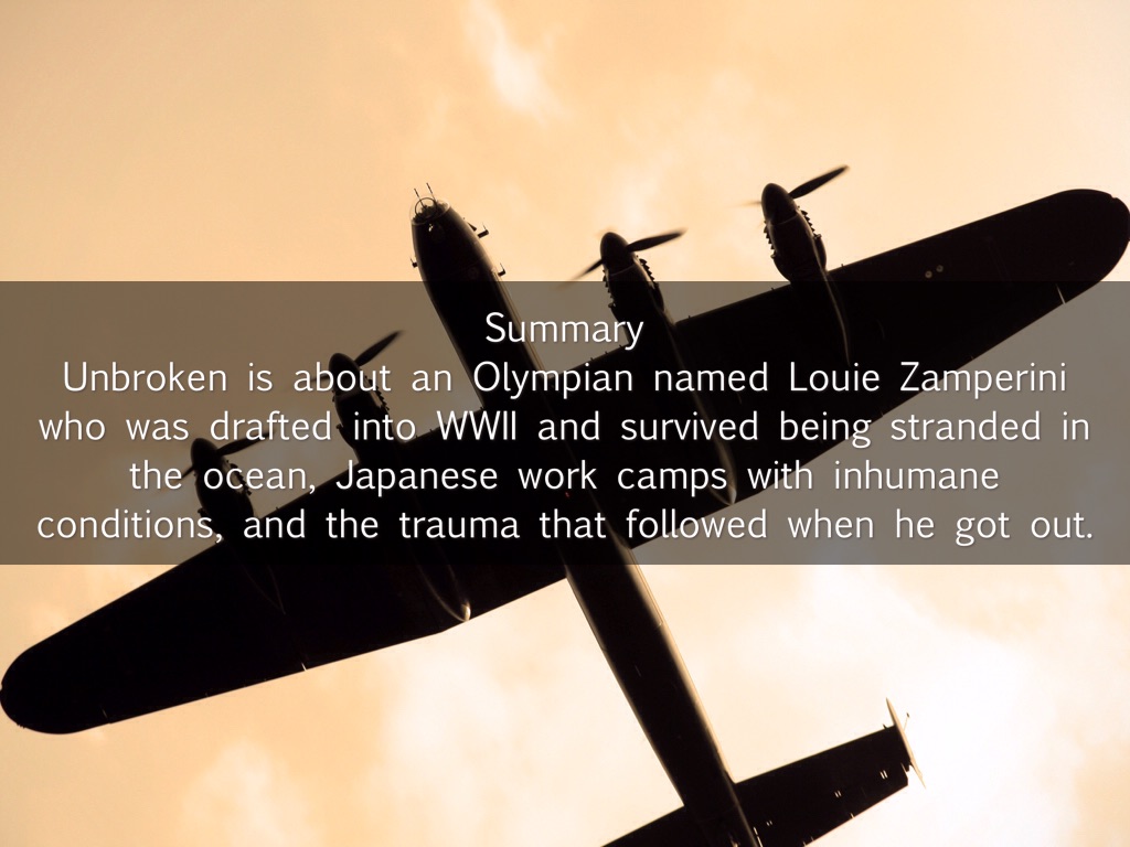 Summary Unbroken is about an Olympian named Louie Zamperini who was drafted into WWII and survived being stranded in the ocean, Japanese work camps with inhumane conditions, and the trauma that followed when he got out.