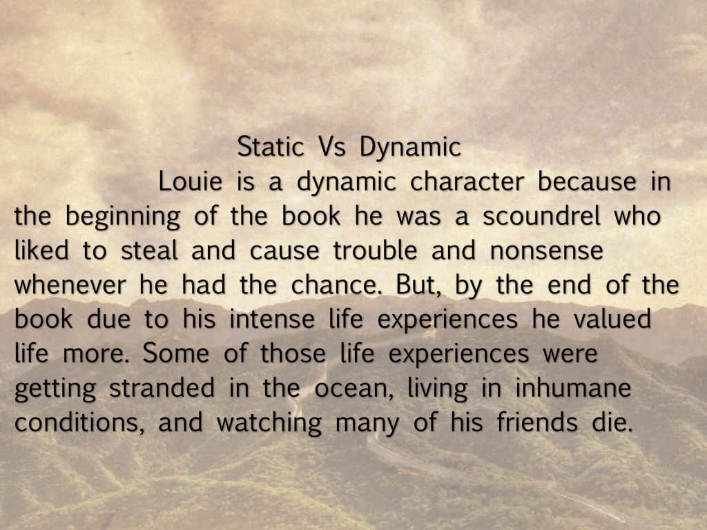 Static Vs Dynamic Louie is a dynamic character because in the beginning of the book he was a scoundrel who liked to steal and cause trouble and nonsense whenever he had the chance. But, by the end of the book due to his intense life experiences he valued life more. Some of those life experiences were getting stranded in the ocean, living in inhumane conditions, and watching many of his friends die.