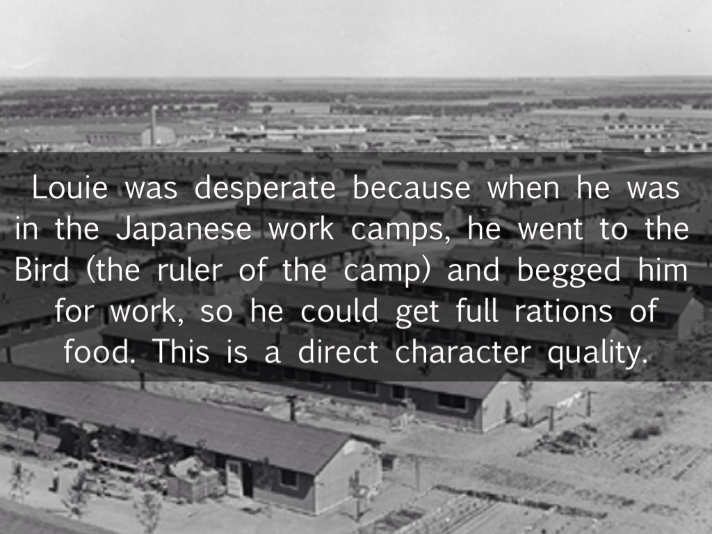 Louie was desperate because when he was in the Japanese work camps, he went to the Bird (the ruler of the camp) and begged him for work, so he could get full rations of food. This is a direct character quality.