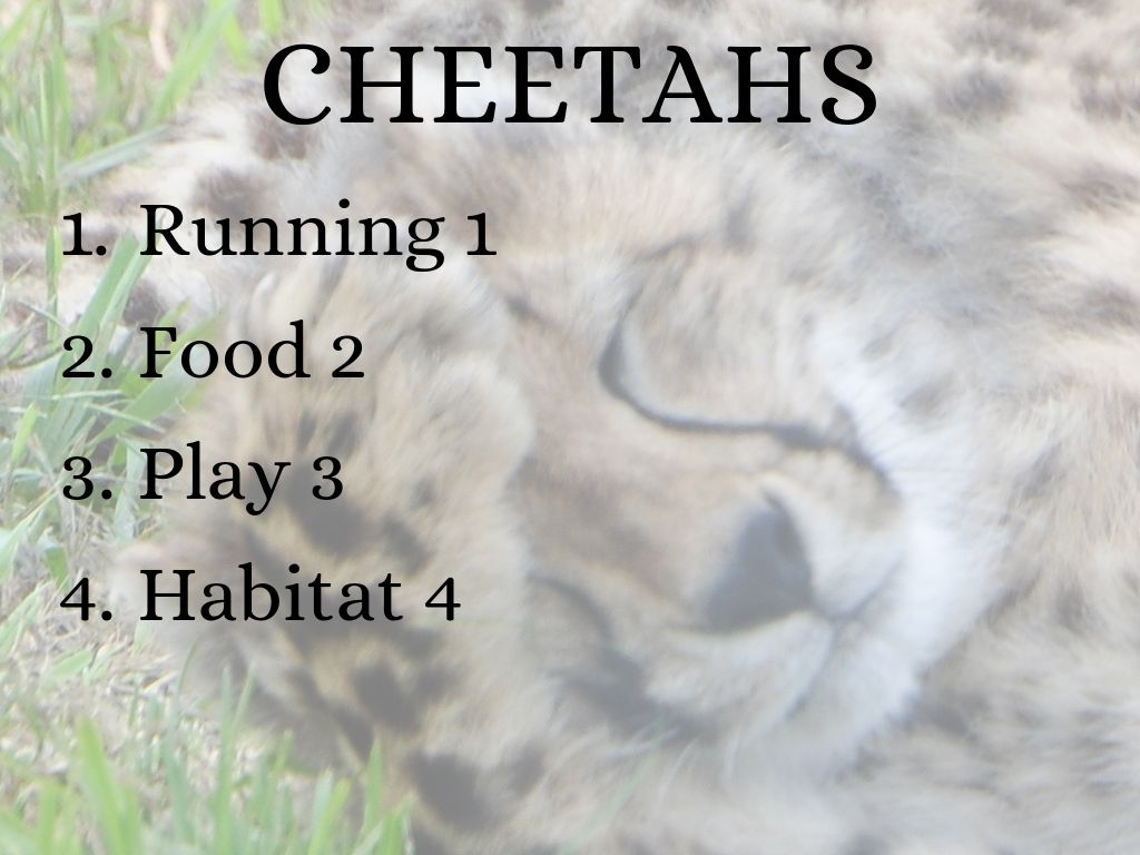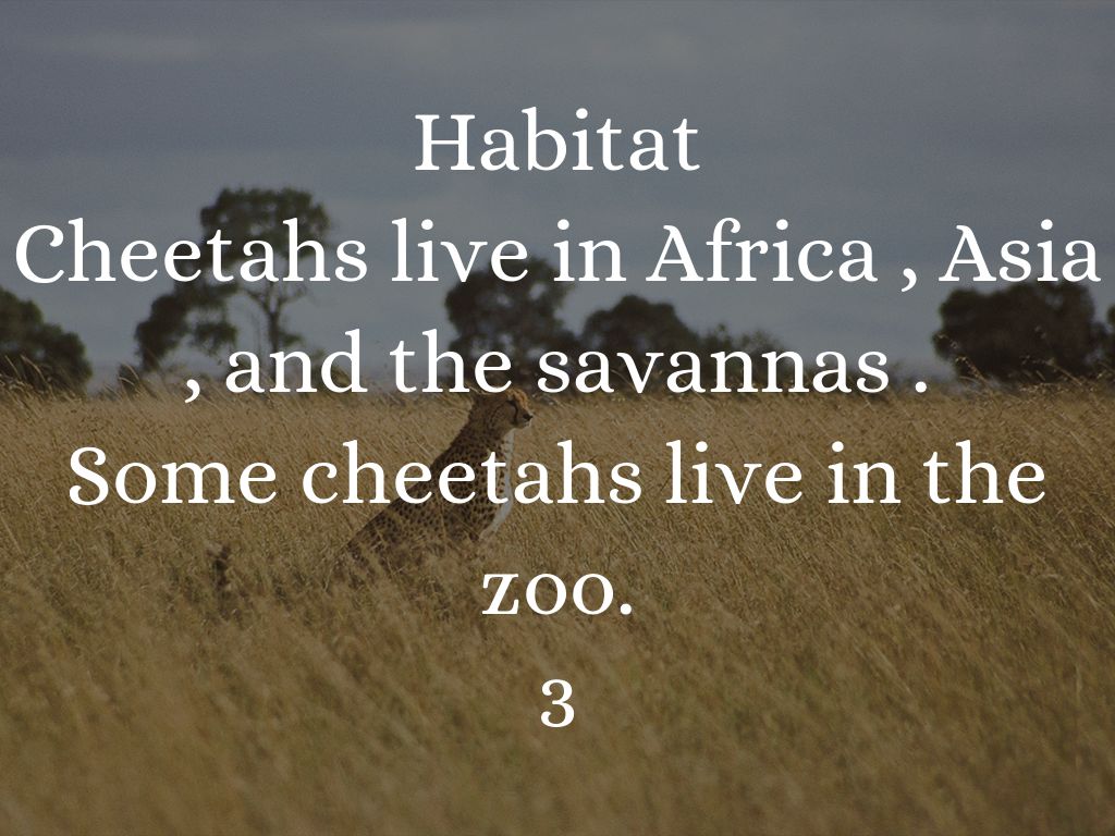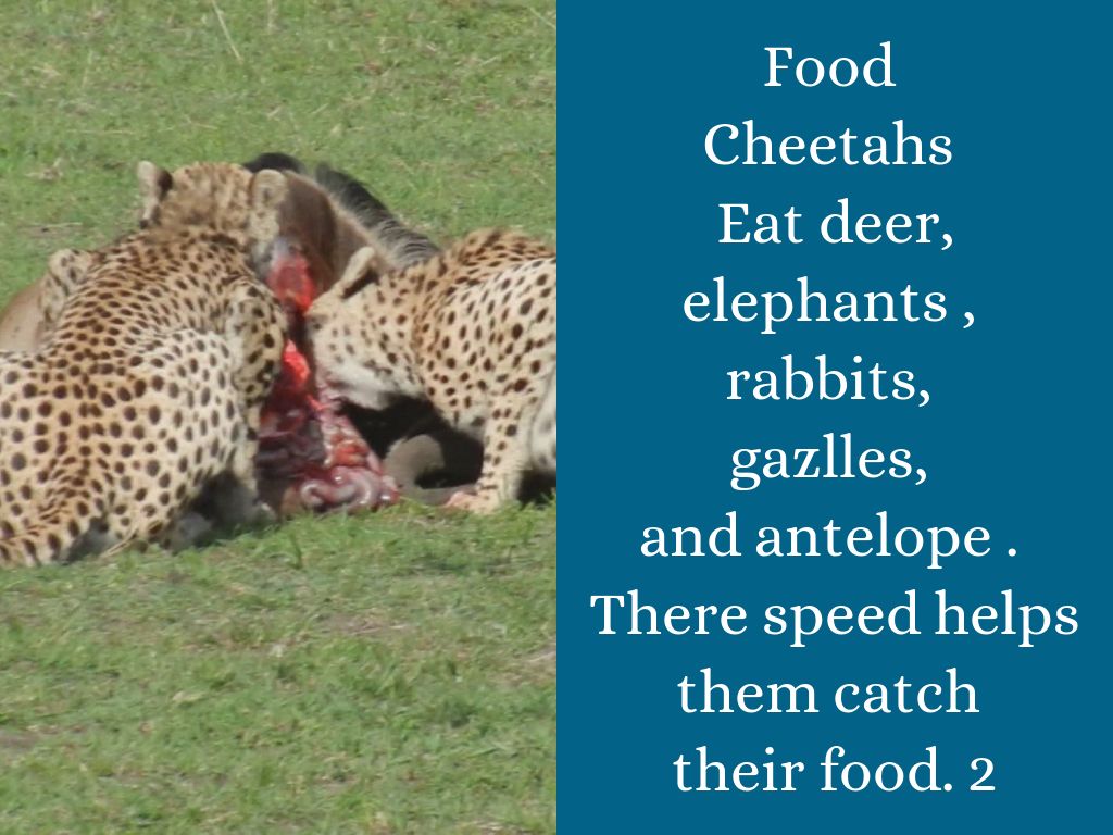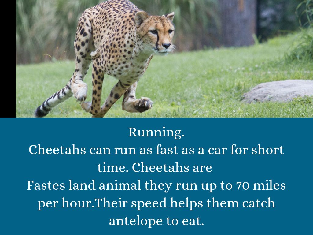 Fastes land animal they run up to 70 miles per hour.Their speed helps them catch antelope to eat.