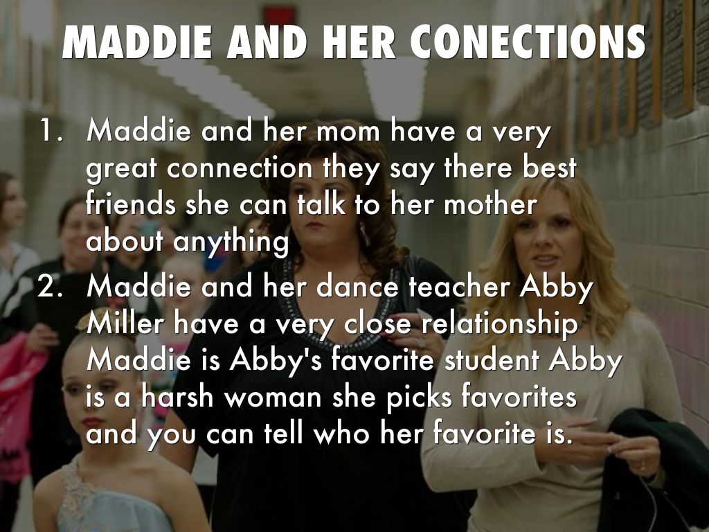 Maddie and her dance teacher Abby Miller have a very close relationship Maddie is Abby's favorite student Abby is a harsh woman she picks favorites and you can tell who her favorite is.