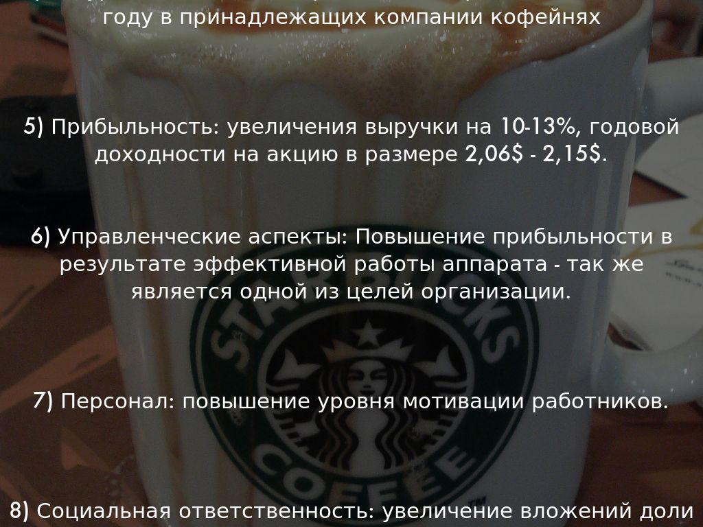 Миссия данной компании: утвердить Starbucks на позициях основного мирового поставщика высококачественного кофе, сохраняя по мере роста и развития приверженность нашим бескомпромиссным принципам.
