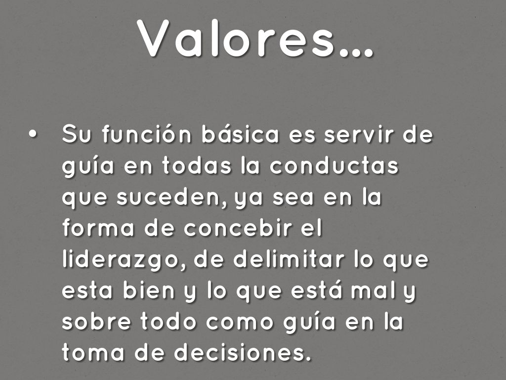 Su función básica es servir de guía en todas la conductas que suceden, ya sea en la forma de concebir el liderazgo, de delimitar lo que esta bien y lo que está mal y sobre todo como guía en la toma de decisiones.