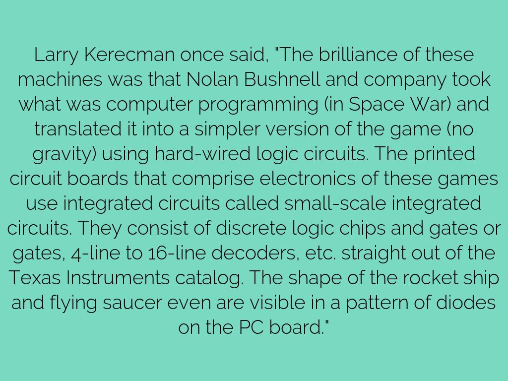Larry Kerecman once said, "The brilliance of these machines was that Nolan Bushnell and company took what was computer programming (in Space War) and translated it into a simpler version of the game (no gravity) using hard-wired logic circuits. The printed circuit boards that comprise electronics of these games use integrated circuits called small-scale integrated circuits. They consist of discrete logic chips and gates or gates, 4-line to 16-line decoders, etc. straight out of the Texas Instruments catalog. The shape of the rocket ship and flying saucer even are visible in a pattern of diodes on the PC board."