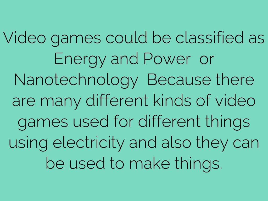 Nanotechnology Because there are many different kinds of video games used for different things using electricity and also they can be used to make things.