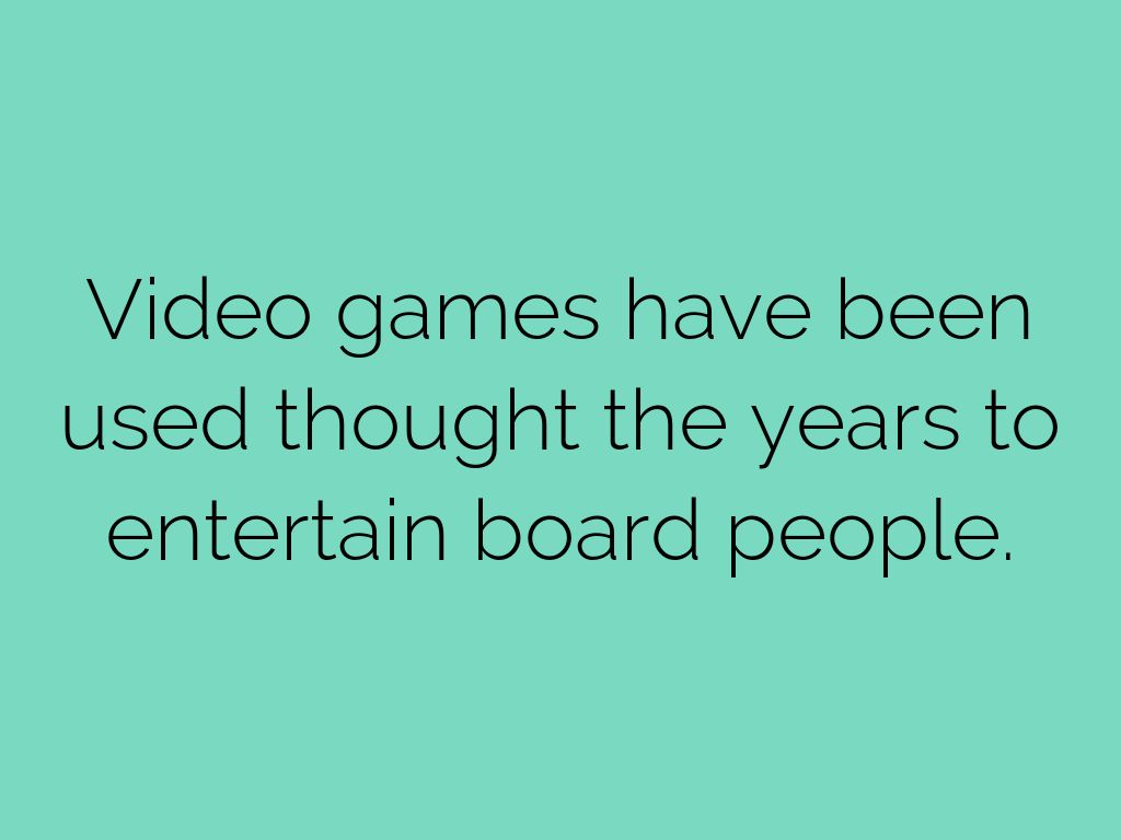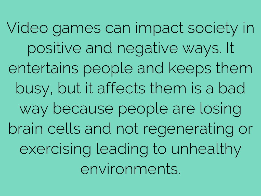Video games can impact society in positive and negative ways. It entertains people and keeps them busy, but it affects them is a bad way because people are losing brain cells and not regenerating or exercising leading to unhealthy environments.