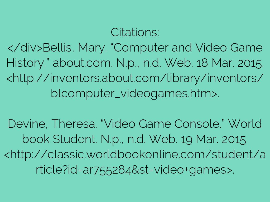 Devine, Theresa. “Video Game Console.” World book Student. N.p., n.d. Web. 19 Mar. 2015. .