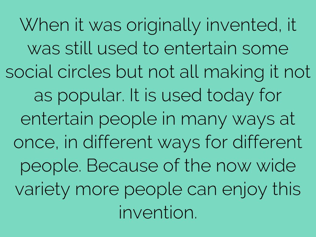 When it was originally invented, it was still used to entertain some social circles but not all making it not as popular. It is used today for entertain people in many ways at once, in different ways for different people. Because of the now wide variety more people can enjoy this invention.