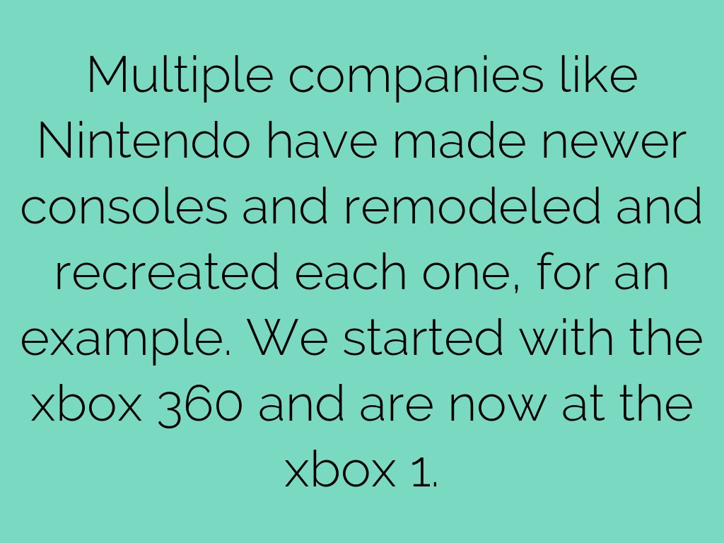 Multiple companies like Nintendo have made newer consoles and remodeled and recreated each one, for an example. We started with the xbox 360 and are now at the xbox 1.
