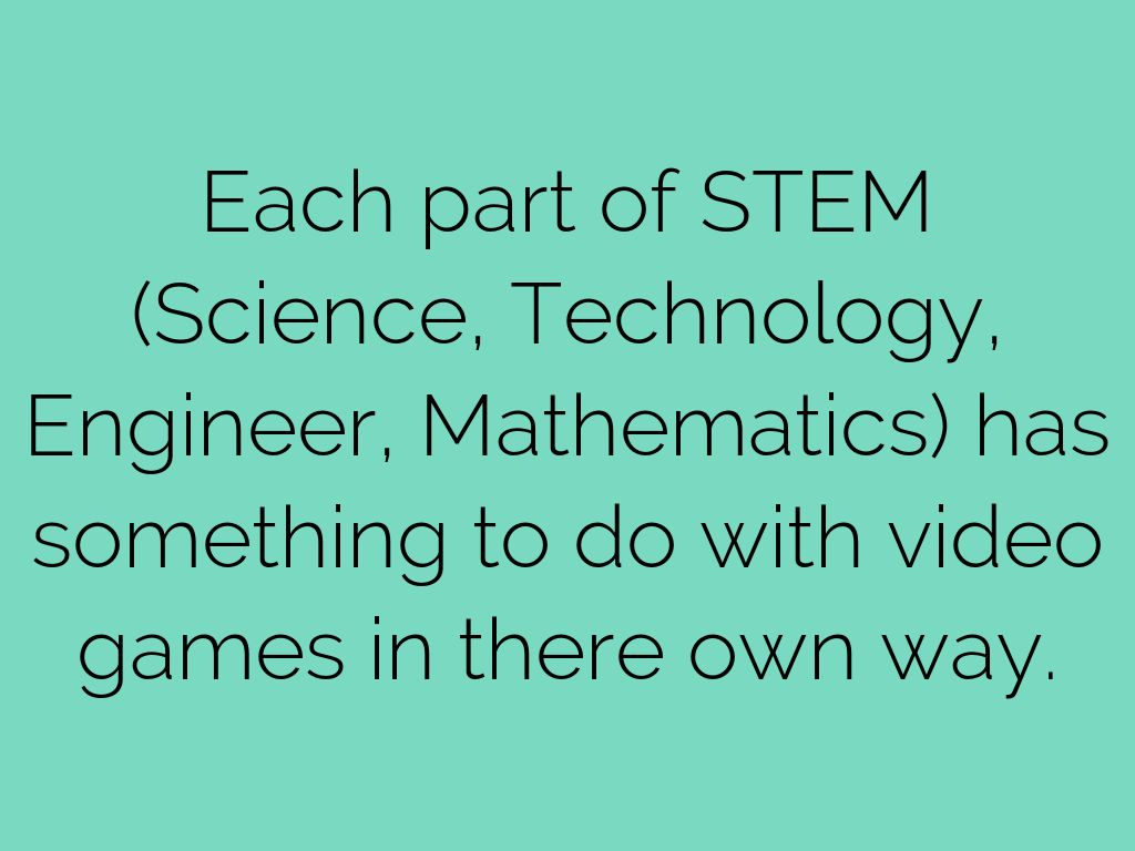 Each part of STEM (Science, Technology, Engineer, Mathematics) has something to do with video games in there own way.