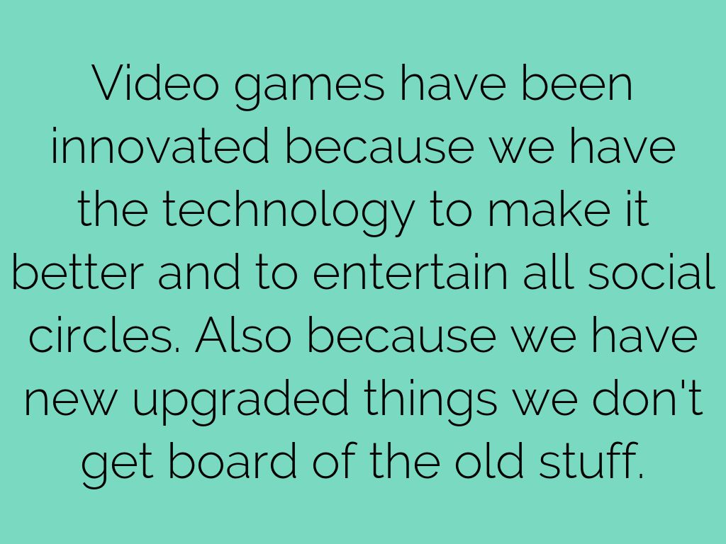 Video games have been innovated because we have the technology to make it better and to entertain all social circles. Also because we have new upgraded things we don't get board of the old stuff.