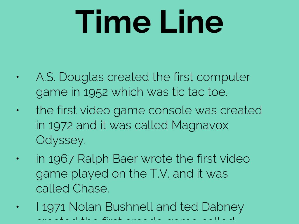 - in 1967 Ralph Baer wrote the first video game played on the T.V. and it was called Chase.
