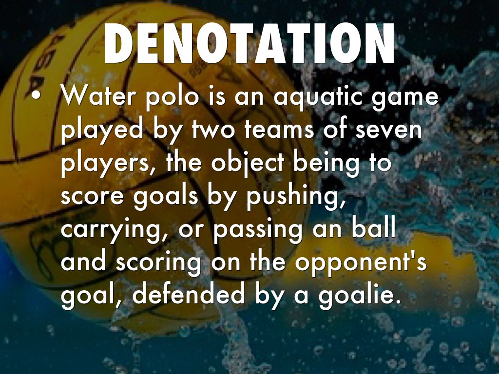 Water polo is an aquatic game played by two teams of seven players, the object being to score goals by pushing, carrying, or passing an ball and scoring on the opponent's goal, defended by a goalie,