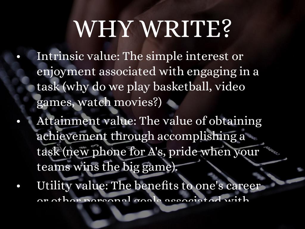 - Intrinsic value: The simple interest or enjoyment associated with engaging in a task (why do we play basketball, video games, watch movies?)