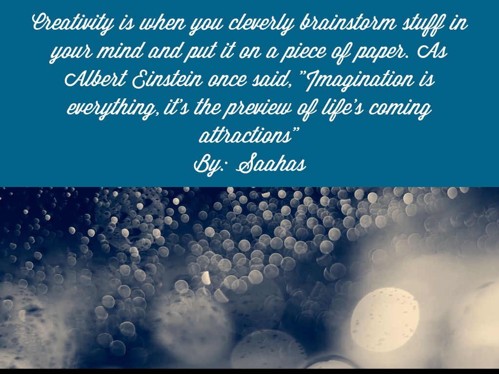 Creativity is when you cleverly brainstorm stuff in your mind and put it on a piece of paper. As Albert Einstein once said, "Imagination is everything, it's the preview of life's coming attractions" By: Saahas