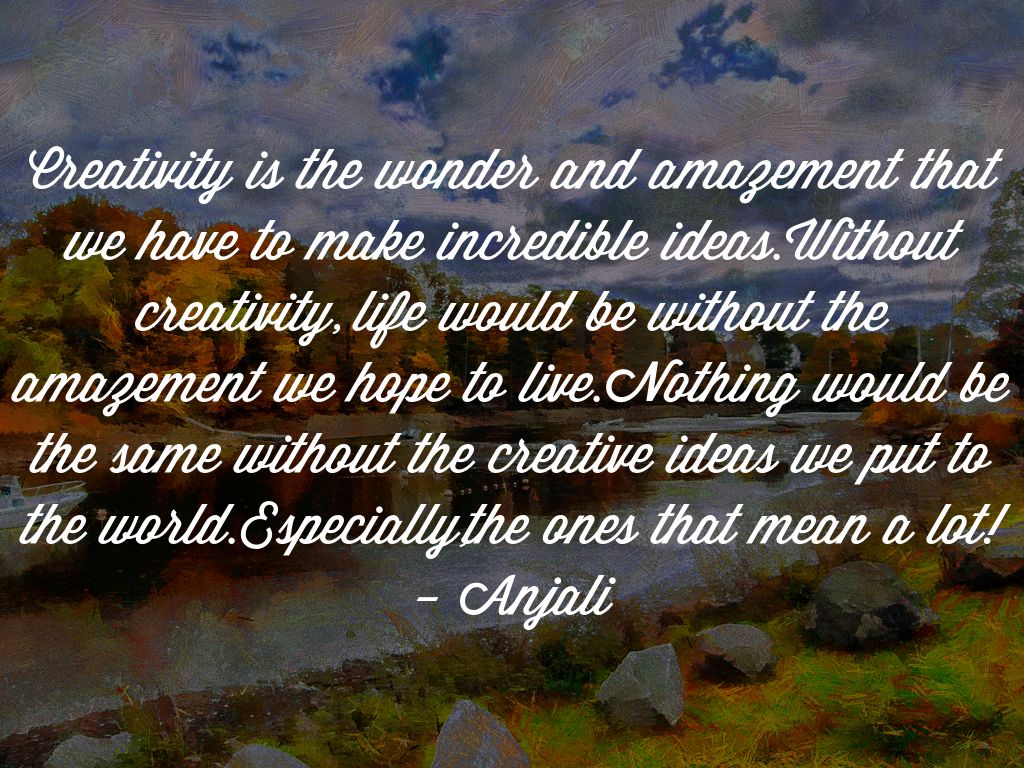 Creativity is the wonder and amazement that we have to make incredible ideas.Without creativity, life would be without the amazement we hope to live.Nothing would be the same without the creative ideas we put to the world.Especially,the ones that mean a lot! - Anjali