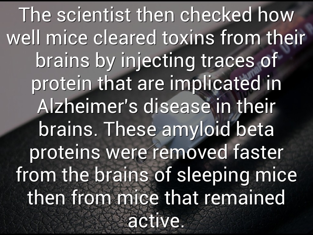 The scientist then checked how well mice cleared toxins from their brains by injecting traces of protein that are implicated in Alzheimer's disease in their brains. These amyloid beta proteins were removed faster from the brains of sleeping mice then from mice that remained active.