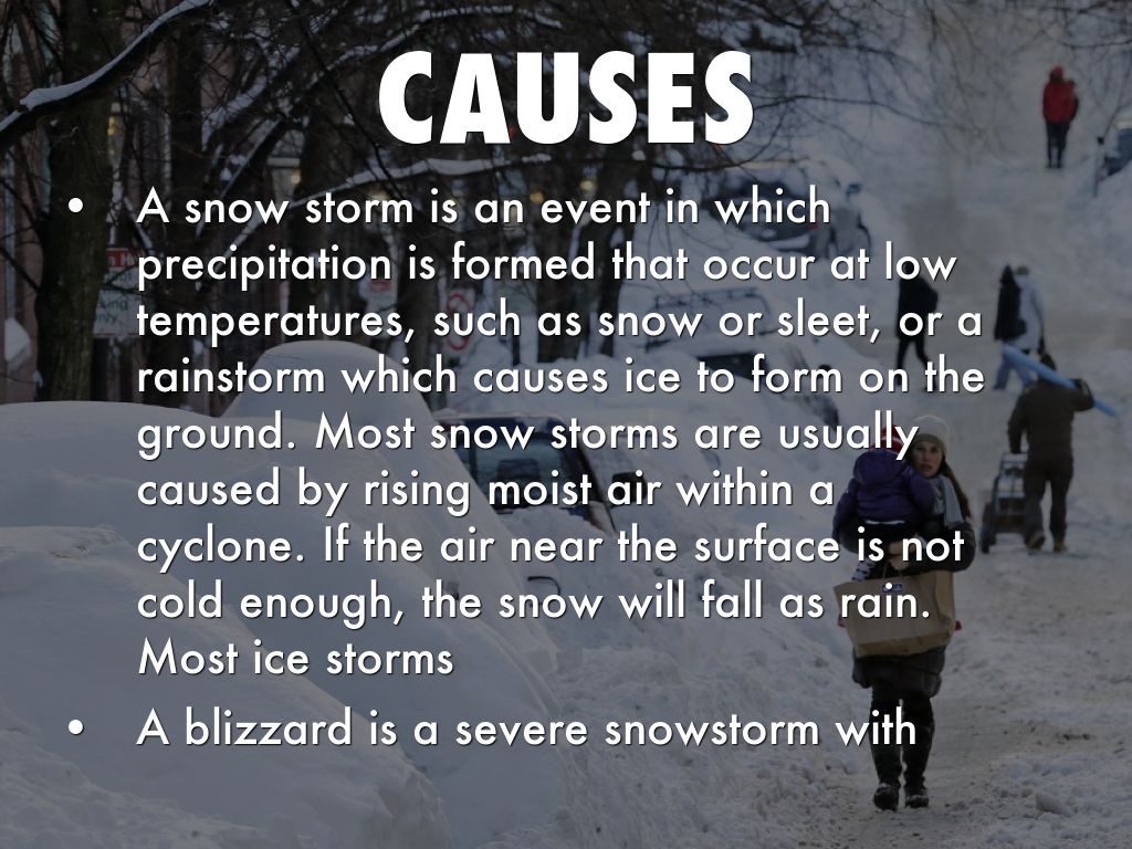 • A snow storm is an event in which precipitation is formed that occur at low temperatures, such as snow or sleet, or a rainstorm which causes ice to form on the ground. Most snow storms are usually caused by rising moist air within a cyclone. If the air near the surface is not cold enough, the snow will fall as rain. Most ice storms