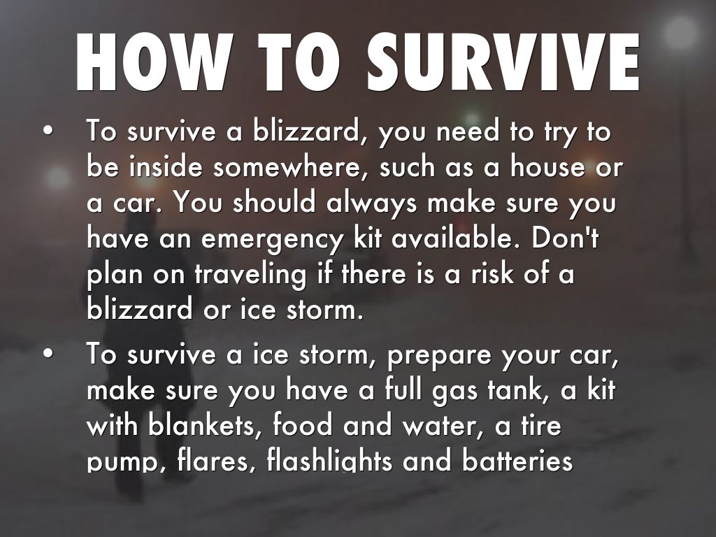 • To survive a ice storm, prepare your car, make sure you have a full gas tank, a kit with blankets, food and water, a tire pump, flares, flashlights and batteries and a first aid kit.
