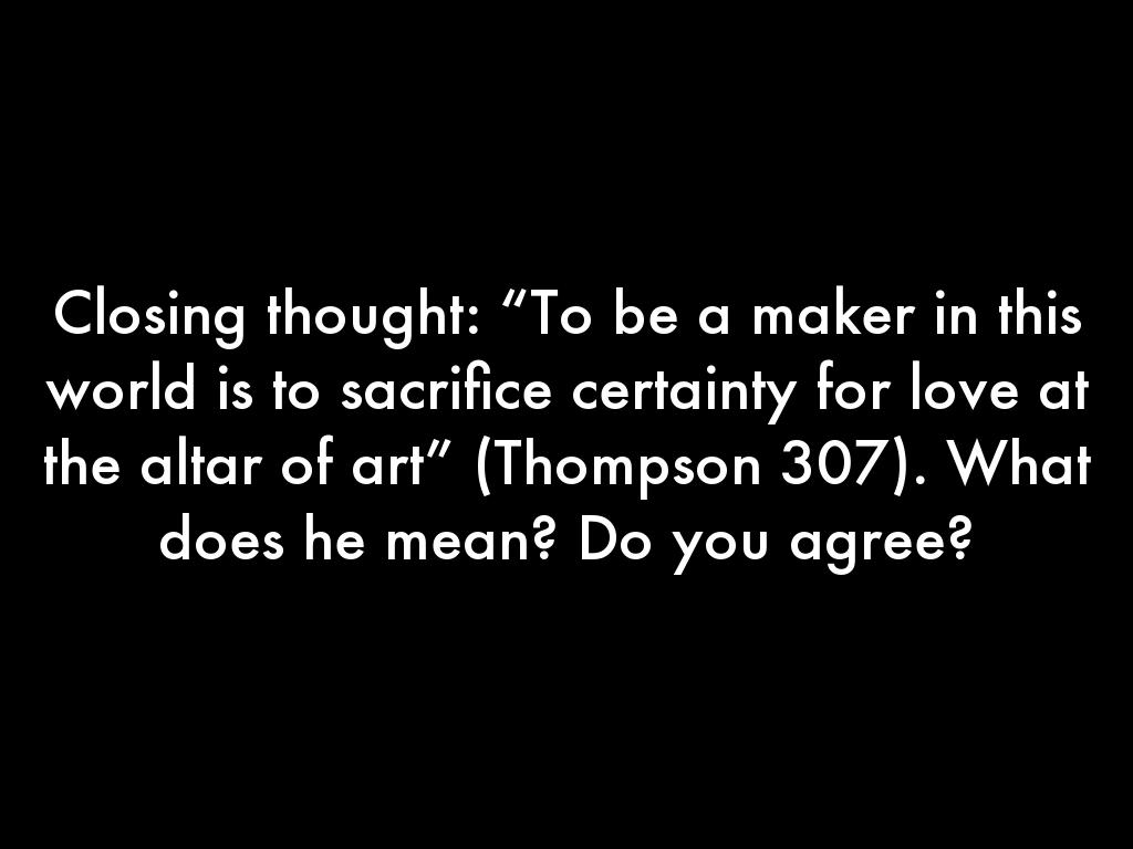 Closing thought: “To be a maker in this world is to sacrifice certainty for love at the altar of art” (Thompson 307). What does he mean? Do you agree?