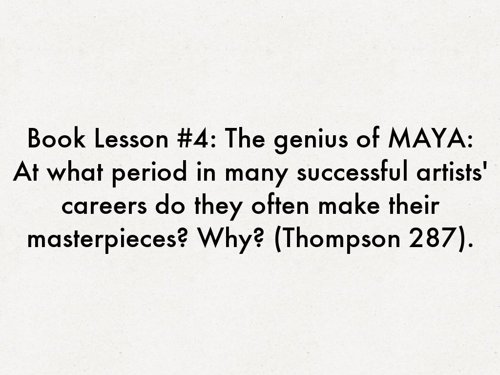 Book Lesson #4: The genius of MAYA: At what period in many successful artists' careers do they often make their masterpieces? Why? (Thompson 287).