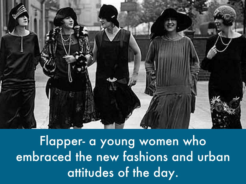Flapper- a young women who embraced the new fashions and urban attitudes of the day.