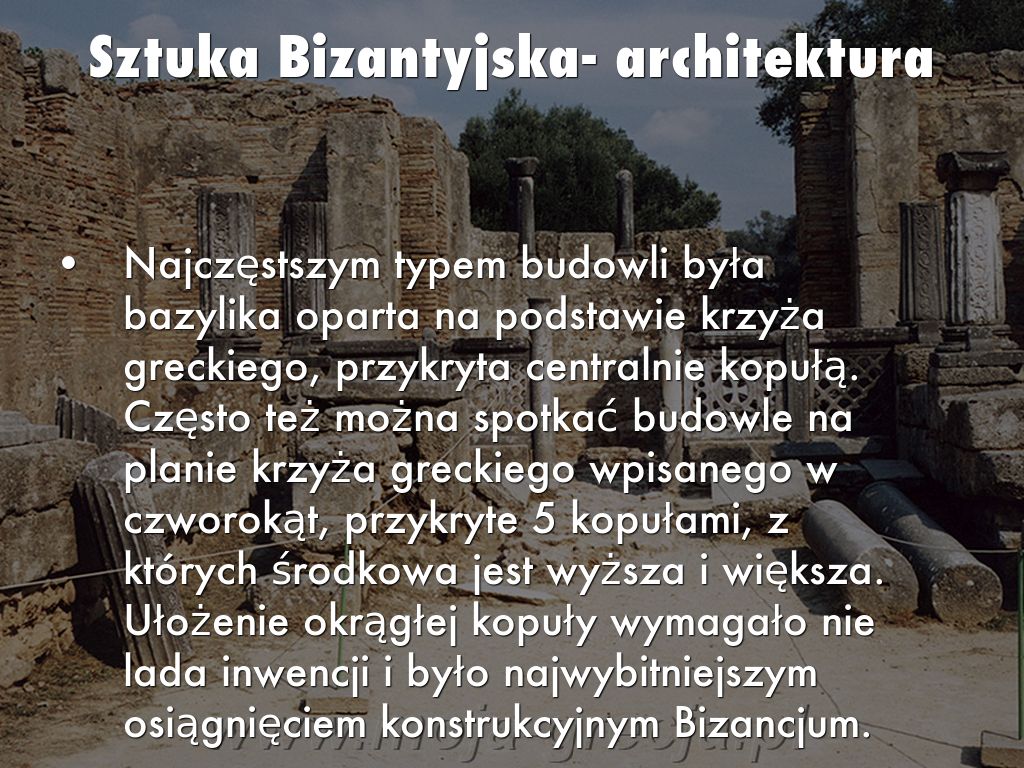 Najczęstszym typem budowli była bazylika oparta na podstawie krzyża greckiego, przykryta centralnie kopułą. Często też można spotkać budowle na planie krzyża greckiego wpisanego w czworokąt, przykryte 5 kopułami, z których środkowa jest wyższa i większa. Ułożenie okrągłej kopuły wymagało nie lada inwencji i było najwybitniejszym osiągnięciem konstrukcyjnym Bizancjum.