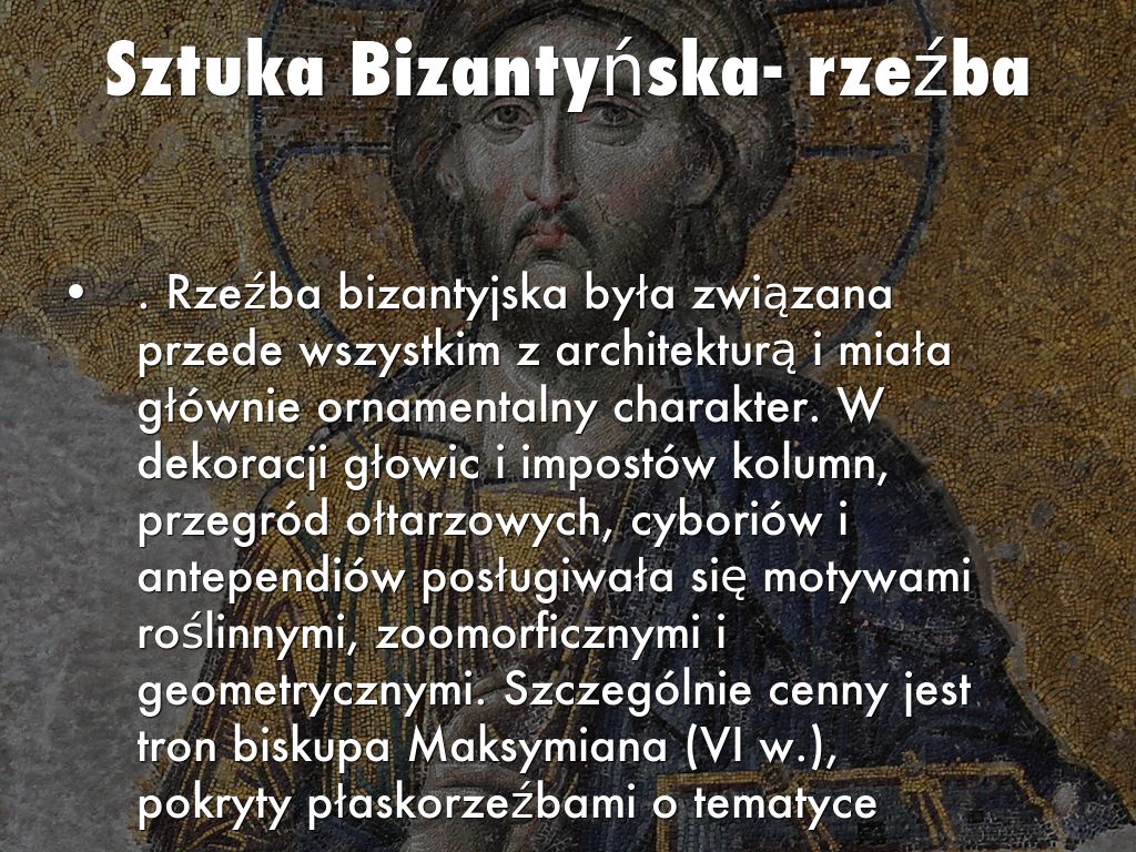 . Rzeźba bizantyjska była związana przede wszystkim z architekturą i miała głównie ornamentalny charakter. W dekoracji głowic i impostów kolumn, przegród ołtarzowych, cyboriów i antependiów posługiwała się motywami roślinnymi, zoomorficznymi i geometrycznymi. Szczególnie cenny jest tron biskupa Maksymiana (VI w.), pokryty płaskorzeźbami o tematyce zaczerpniętej ze Starego i Nowego Testamentu.
